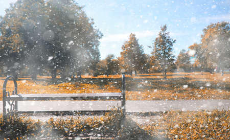 Bench in the park during a snowfall. Beautiful winter landscape.
