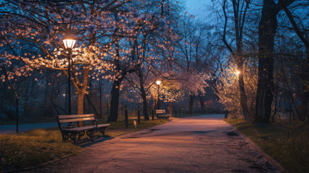 Tranquil Night in Cherry Blossom Park with Illuminated Path