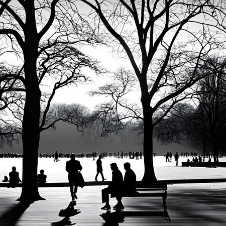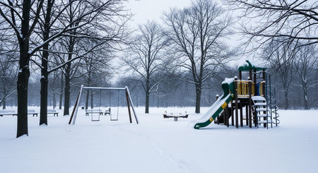 A serene yet melancholic scene of a public park during a foggy winter day, with a fresh blanket of snow covering the ground. Bare trees and empty park benches contribute to the quiet, desolate, and peaceful atmosphere of the cold season.