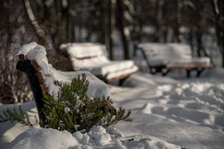 Winter park and benches covered with snow and frost