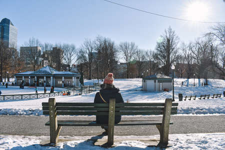 Girl sitting on a bench contemplates the snowy park on a sunny winter day