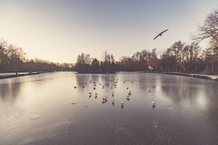Winter landscape with a beautiful sunrise over a frozen lake with gulls