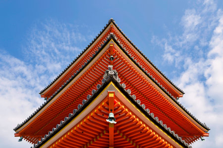 Kyoto, Japan - October 16, 2023: Symmetrical upward view of the vividly painted eaves and tiled roofs of the Sanjunoto Three Story Pagoda at Kiyomizu-dera temple, with a clear blue sky and scattered clouds in the background.