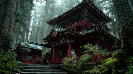 A striking red temple nestled in a lush green forest, shrouded in mist, creating a tranquil and serene atmosphere perfect for exploring nature's beauty.
