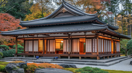 Elegant japanese gazebo surrounded by lush garden, showcasing architectural beauty in soft light