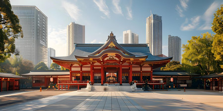 Encounter of Tradition and Modernity: Shinto Shrine amidst Modern Skyscrapers in a Vibrant Japanese City. Concept Traditional & Modern Architecture, Japanese Culture, Urban Landscape