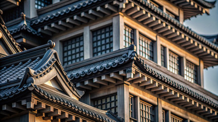 close-up of intricate details of japan pagoda, with sunlight shining through, created with generative ai
