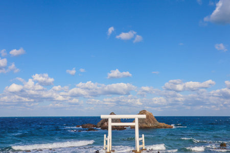 White Torii Gate Standing in the Sea at Futamigaura, Itoshima, Japan Under Blue Sky