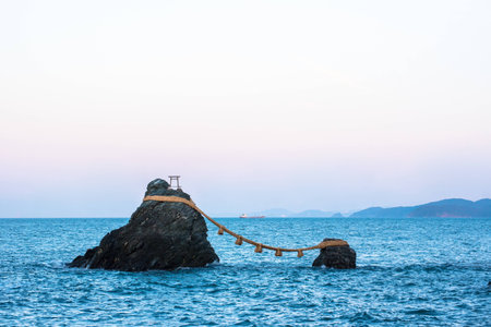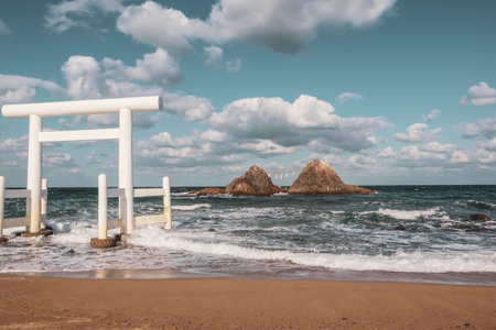 Sacred Shinto Shrine Gate by the Sea with Wedded Rocks, Fukuoka Japan