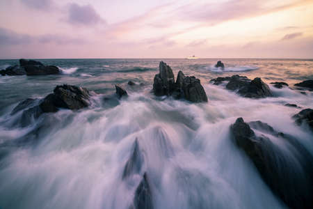 A stormy sea with rocks in Dalian, Liaoning at sunset