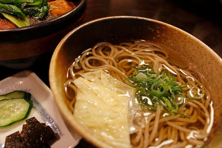 Japanese set meal wheat soba noodle with Cold homemade traditional sauce in the Japanese restaurant