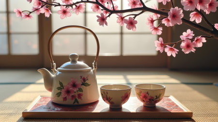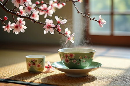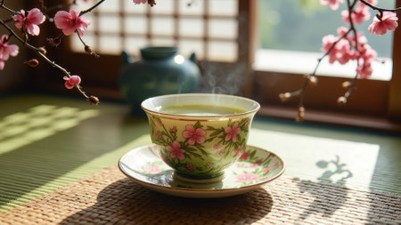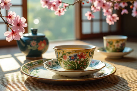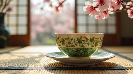 Japanese tea ceremony with blossom motif cup and saucer in tranquil sunlit room. That the image is generated using AI.