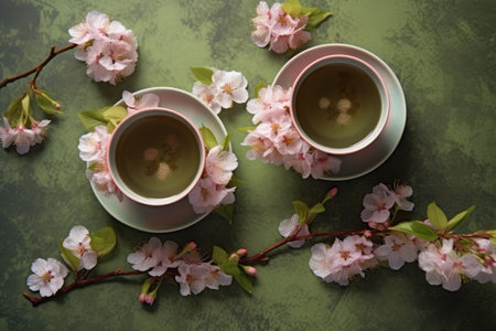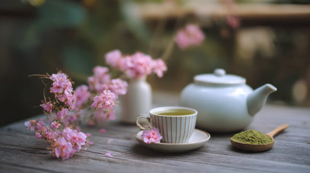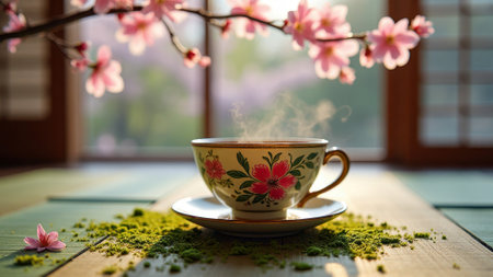 Steaming green tea in floral cup by cherry blossoms on sunny day. That the image is generated using AI.