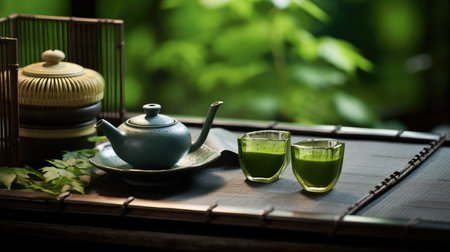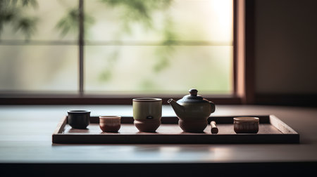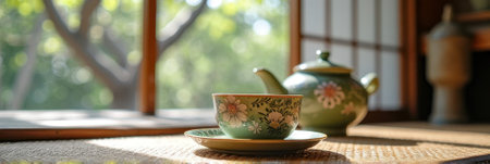Green floral tea set in sunny room with Japanese window view. That the image is generated using AI.