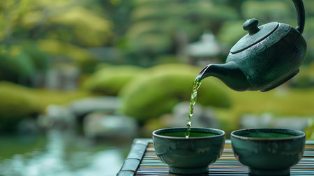 Pouring fresh aromatic matcha green tea from a traditional Japanese teapot into a ceramic cup with a blurred background of a serene tranquil Japanese garden landscape