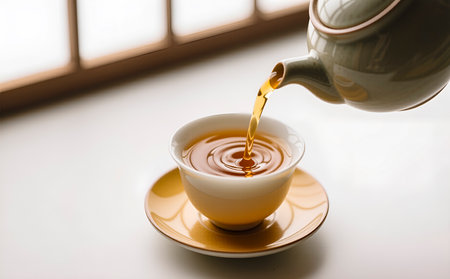 Pouring tea from teapot into a cup, closeup