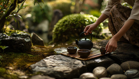 Traditional Japanese tea ceremony within a serene garden setting. Generative AI