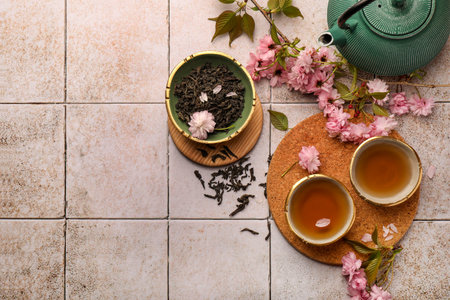 Traditional ceremony. Cup of brewed tea, teapot, dried leaves and sakura flowers on tiled table, flat lay with space for text