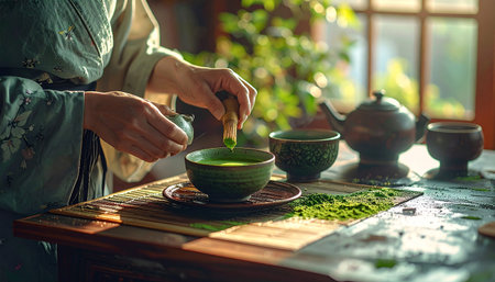 An elegant kimono japanese woman tea bowl matcha ceremony traditional tatami sunlight serene mood cultural ritual. elegant kimono japanese woman
