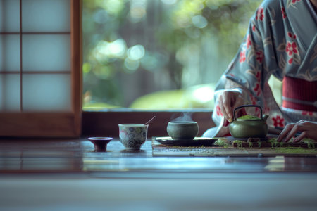 A woman performing a tea ceremony ritual in a tranquil Japanese setting with traditional elements