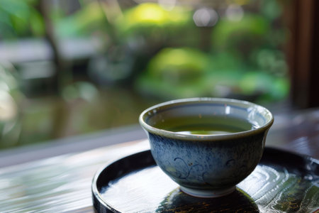 A tranquil cup of green tea on a wooden table with a serene garden backdrop, showcasing nature s beauty and relaxation