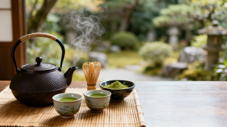 A traditional Japanese tea ceremony setting features a steaming cast iron teapot and matcha tea bowls on a bamboo mat. The serene scene, with a blurred Japanese Zen garden background, evokes peace and