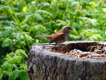 Little brown bird eating seeds in tree stump