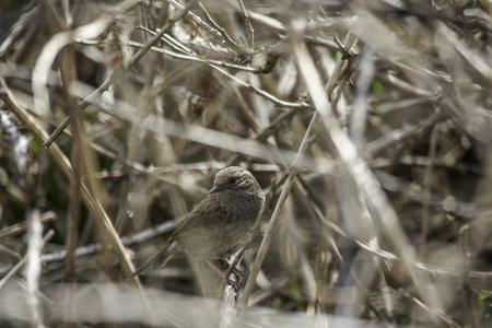 Hedge Accentor (Dunnock) perching on a dead stem near East Grinstead