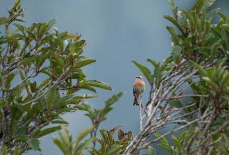 A common stonechat is perched on a branch in the bush.