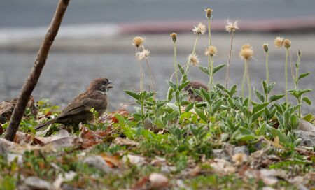 A sparrow standing next to the grass flower