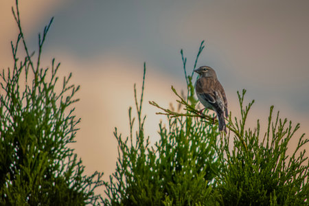 Small passerine bird sitting on the background of mountain range Ornithology and seasonal migration of birds, birdwatching copy space