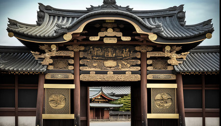 Front view of decorated entrance to the Nijo castle in Kyoto, Japan