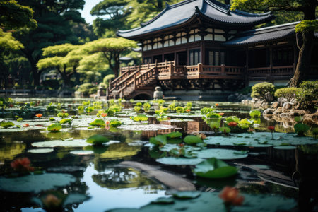 enormous japan pagoda surrounded by lush gardens, with water features and lanterns, created with generative ai