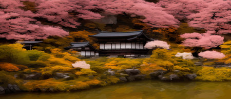 A serene Japanese garden with blooming cherry blossoms, a tranquil pond, and a traditional temple in the background, capturing the essence of peace and beauty.