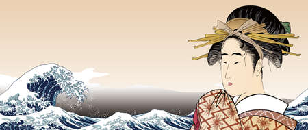 Woman wearing traditional Japanese clothes. Geisha costume. Flower pattern.