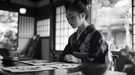 A woman in a traditional kimono, sitting at a table, is writing calligraphy.
