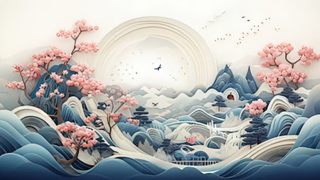 Vector illustration of Japanese Mount Fuji with variety of trees, Ideal for travel, sports or spiritual design. Asian scenic wallpaper with cherry trees Mount Fuji. banner