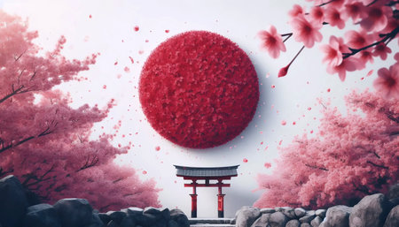 A Japanese flag in cherry blossom sakura spring festival, Ai generated image