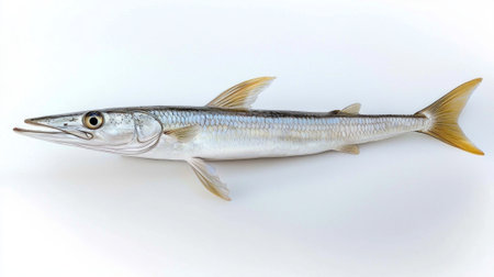 striking Barracuda known as Sphyraena is displayed against a crisp white backdrop highlighting its sleek form and sharp teeth typical of predatory fish.