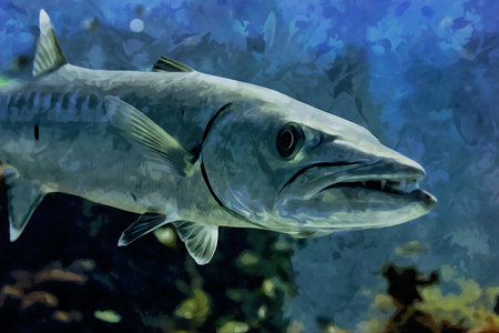 Digitally created watercolor painting of a large Great Barracuda hunting over the coral reef in the Cayman Islands