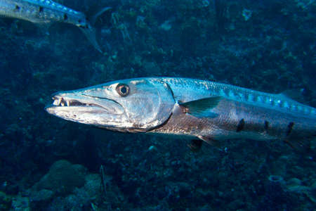 A large Barracuda on a dark tropical coral reef (Richelieu Rock, Thailand)