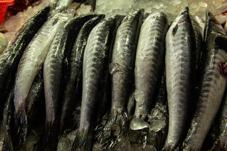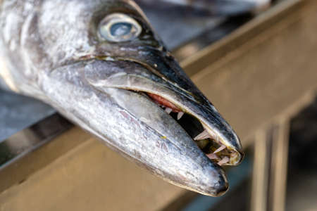 Close up on barracuda teeth. Sea fresh fish barracuda at street food market in Thailand. Seafood concept. Raw barracuda for cooking