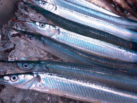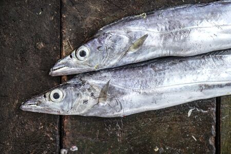 Barracuda or Seapike ( Sphyraenidae ) fish in a steel tray, Sea fishes in market, Thailand