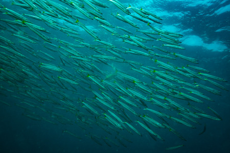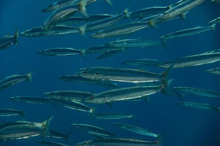 School of Chevron Barracuda, Sphyraena Putnamiae in a tropical blue waters of Andaman sea