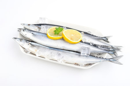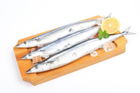 Three pacific sauries on the bamboo colander isolated on a white background.