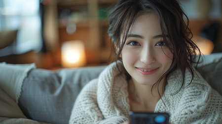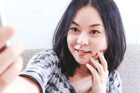 young beautiful and happy Asian Korean woman at home living room sofa couch using internet social media app on mobile phone smiling cheerful
