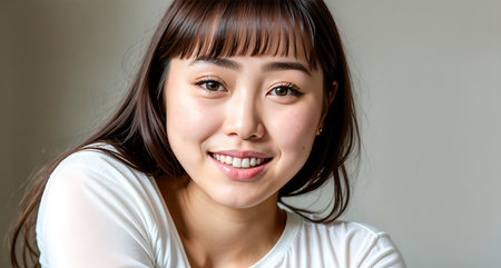 Cheerful 22-year-old Japanese girl smiling warmly, with natural lighting and a soft background, radiating charm and friendliness.