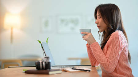 Side view of Pretty young woman feels calm and relaxed after drinking hot cappuccino coffee at restaurant. coffee break