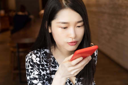 Chinese American woman deep in thought using an red smart phone in a coffee shop