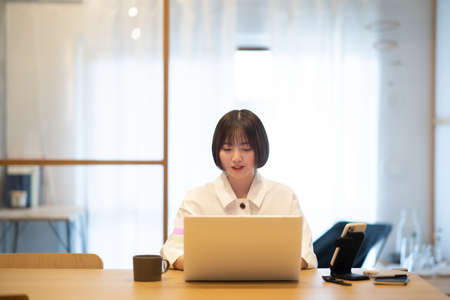 A working Japanese woman by remote work in the home office closeup